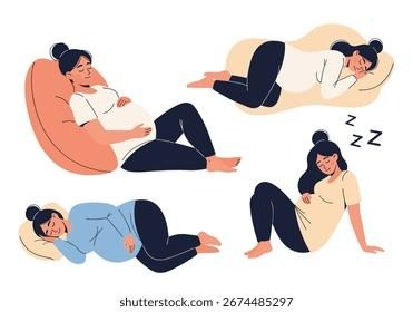 आराम के लिए प्रेग्नेंसी पिलो या सामान्य तकिए इस्तेमाल करें। घुटनों के बीच तकिया रखें ताकि कूल्हे संरेखित रहें, पीठ के पीछे सपोर्ट के लिए और पेट के नीचे। इससे पीठ दर्द कम होता है और नींद बेहतर आती है।